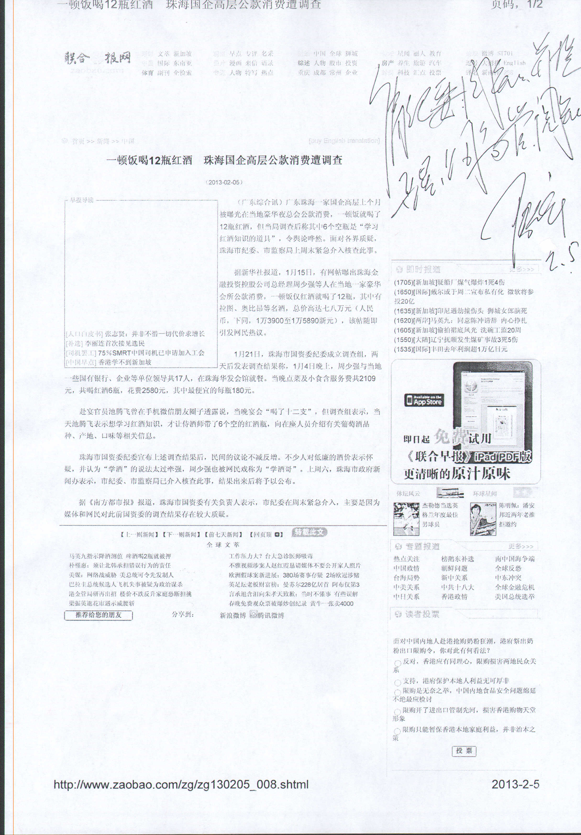 陸金龍董事長對網(wǎng)載“珠海國企高層公款消費”作出批示,提醒公司高管引以為戒2月5日聯(lián)合早報網(wǎng)...
