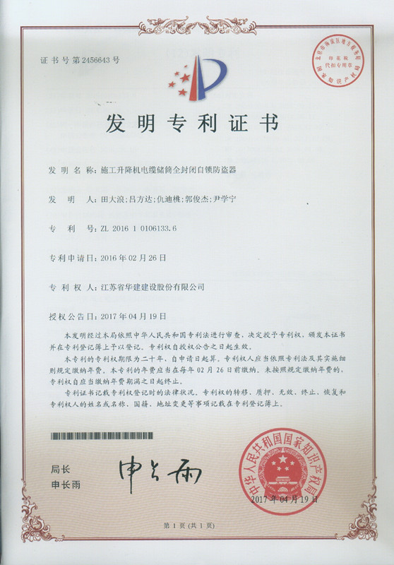 日前,公司又一項(xiàng)發(fā)明專利獲得國(guó)家知識(shí)產(chǎn)權(quán)局授權(quán),此項(xiàng)專利名稱為施工升降機(jī)電纜儲(chǔ)筒全封閉自鎖防盜器,專利號(hào)為ZL 2016 1 0106133.6