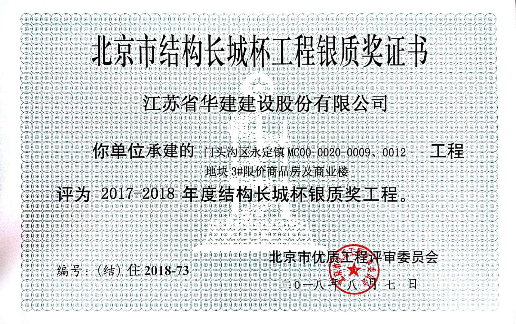 近日,北京市工程建設質量管理協會公布了2017-2018年度北京市結構長城杯工程及獲獎單位,由北京公司承建的門頭溝區永定鎮MC00-0020-00090012地塊3#限價商品房及商業樓項目獲得結構長城杯銀質獎。
