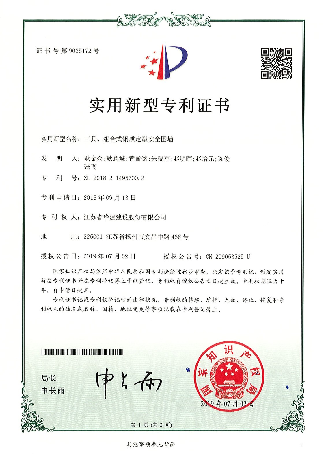 實用新型專利證書(工具、組合式鋼質(zhì)定型安全圍墻)
