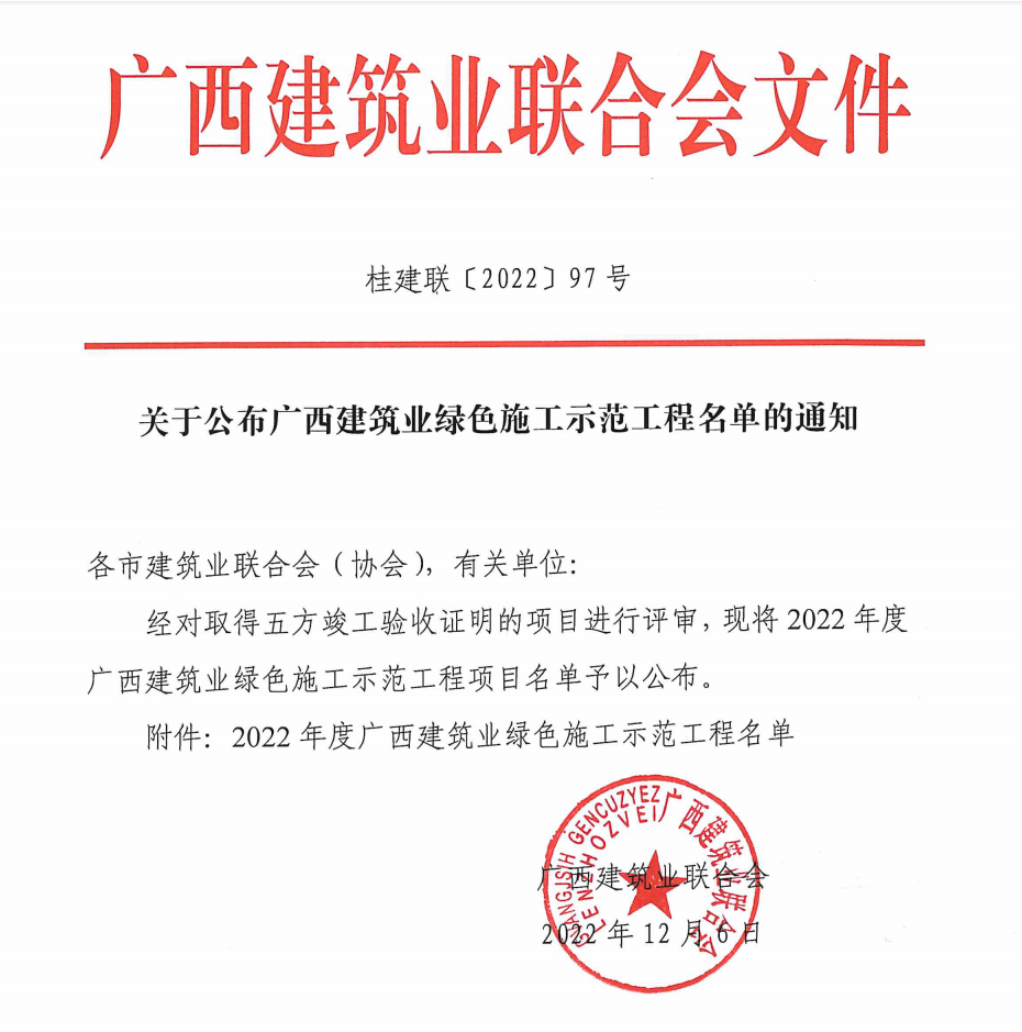 近日,從廣西建筑業聯合會傳來喜訊,由北京公司總包承建的楊柳郡柳園1#、2#、3#、4#樓及地下室項目和楊柳郡柳園5#、6#、7#及地下室項目榮獲2022年度廣西建筑業綠色施工示范工程光榮稱號。