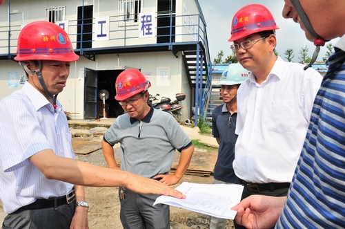 812日下午,揚州市政府副市長陳揚、市建設局局長楊正福一行前往江蘇華建代建的揚州建設大廈暨規劃展覽館、市民中心項目工地現場視察。揚州建工控股公司、江蘇華建董事長陸金龍陪同視察,并將工程施工進展情況向陳副市長作了簡要匯報。陳副市長對建設大廈總體施工進展表示滿意,并提出希望所有參建單位精心組織,科學管理,確保這一政府重點工程建設順利推進。公司領導程杰等一起陪同視察。