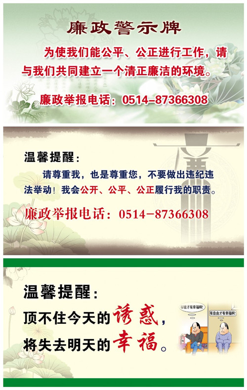 近年來,隨著公司轉型升級發展加快,房地產開發、污水處理、BT等靈活投資方式日益增多,公司黨委非常重視投資項目廉政建設,為從源頭上預防和堅決遏制公司投資項目建設過程中違法違紀行為的發生,決定由紀委、監察室總負責,對投資項目實施監察,實行工作前移、過程監督,并出臺相關實施辦法。監察工作具體由公司紀檢監察室負責,除加強廉潔從業教育和相關法律法規教育外,重點督促和檢查各項工作制度的建立和落實,與相關方簽訂《廉政責任書》、《廉政合同》,對重點環節進行督查,確保廉政責任與經營責任同步實施,同時在辦公場所和項目現場設置醒目的廉政警示牌,公布舉報電話,及時處理人民來信來訪,查處違紀違規行為。12月中下旬,公司黨委副書記、監事會主席吳士茂和黨委委員、紀委書記錢啟明及黨委委員、副總經理程杰等領導先后赴鹽城華建置業、揚州華盛置業開展廉政教育,組織全體員工舉行莊重的廉潔從業宣誓儀式,并與相關方簽訂《廉政責任書》和《廉政合同》,希望公司工作人員嚴以律己、廉潔從業,并希望相關方理解和支持,共同打造優質工程、品牌工程、廉政工程。
