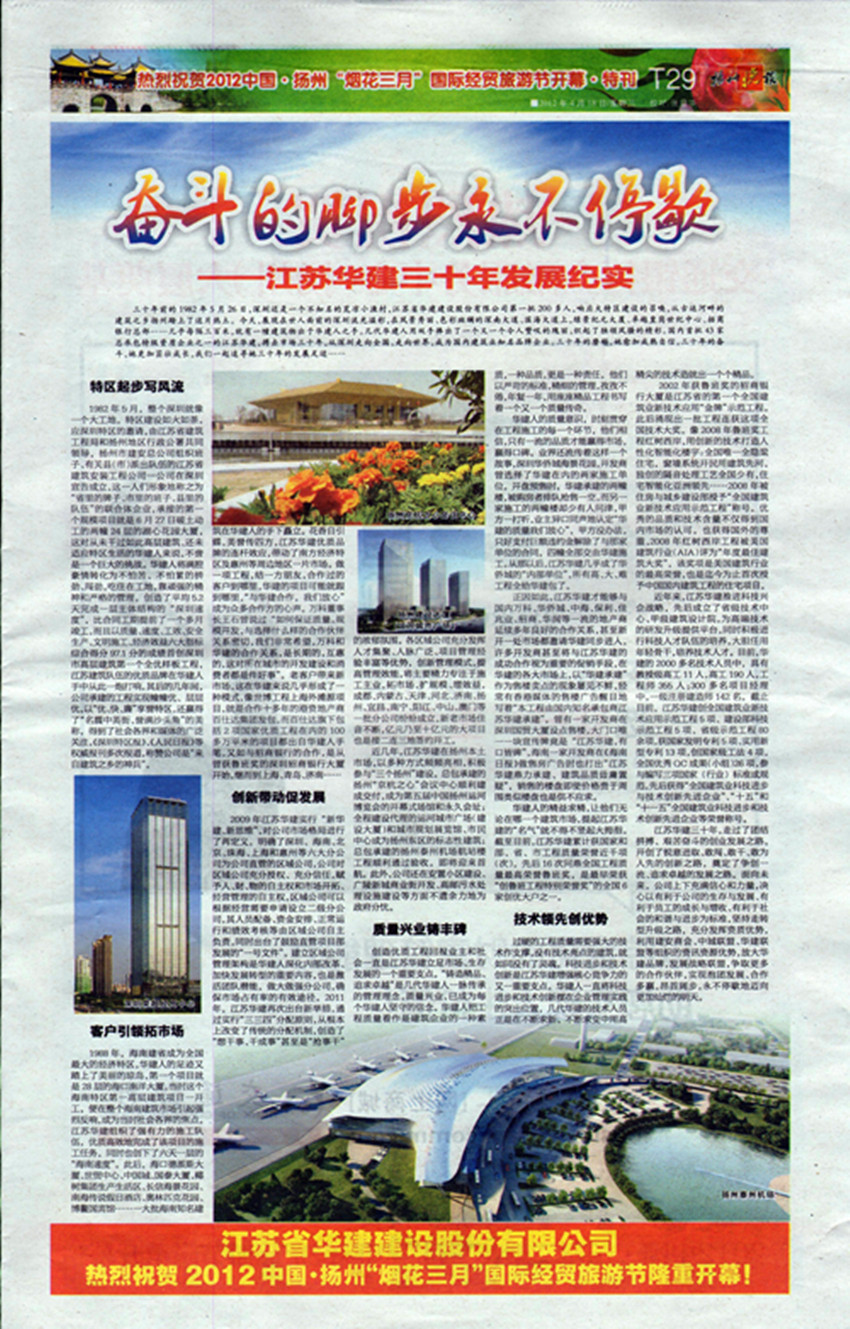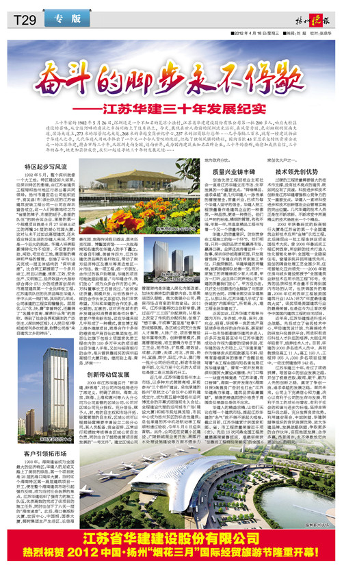 418日,《揚(yáng)州晚報(bào)》T29版刊發(fā)專版文章《奮斗的腳步永不停歇——江蘇華建三十年發(fā)展紀(jì)實(shí)》,從公司起步、市場(chǎng)開(kāi)拓、創(chuàng)新發(fā)展、質(zhì)量與科技等各個(gè)層面,介紹了公司三十年的奮斗歷程、綜合實(shí)力和發(fā)展業(yè)績(jī)。