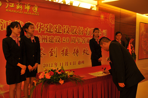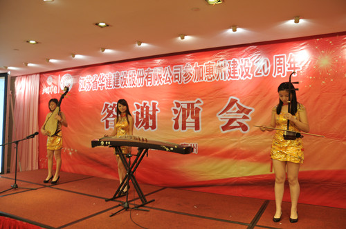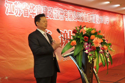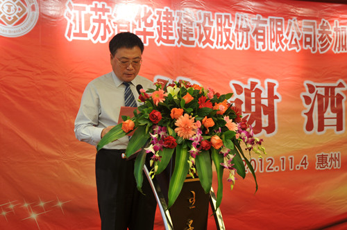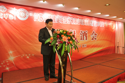 114,公司在惠州隆重舉辦參加惠州建設20周年答謝酒會,副董事長、總經理宗有農主持并作開場致辭。惠州市有關政府部門、部分合作方企業的負責人,華建聯盟成員單位負責人,公司董事、監事和高管等130余人出席酒會。惠州公司總經理華恒榮介紹了公司參加惠州建設二十年的有關情況。惠州市工商聯主席、恒宇實業發展公司董事長楊滿芳代表合作方發言,惠州市住房和城鄉規劃建設局副局長陳訓政代表政府主管部門致辭,分別對江蘇華建進惠施工二十周年表示祝賀。公司董事長陸金龍代表總部對惠州市有關政府部門、相關合作方和社會各界人士給予公司的關心和支持表示誠摯的感謝,并表達了進一步加大支持力度、加強戰略合作、加快科學發展的意愿。