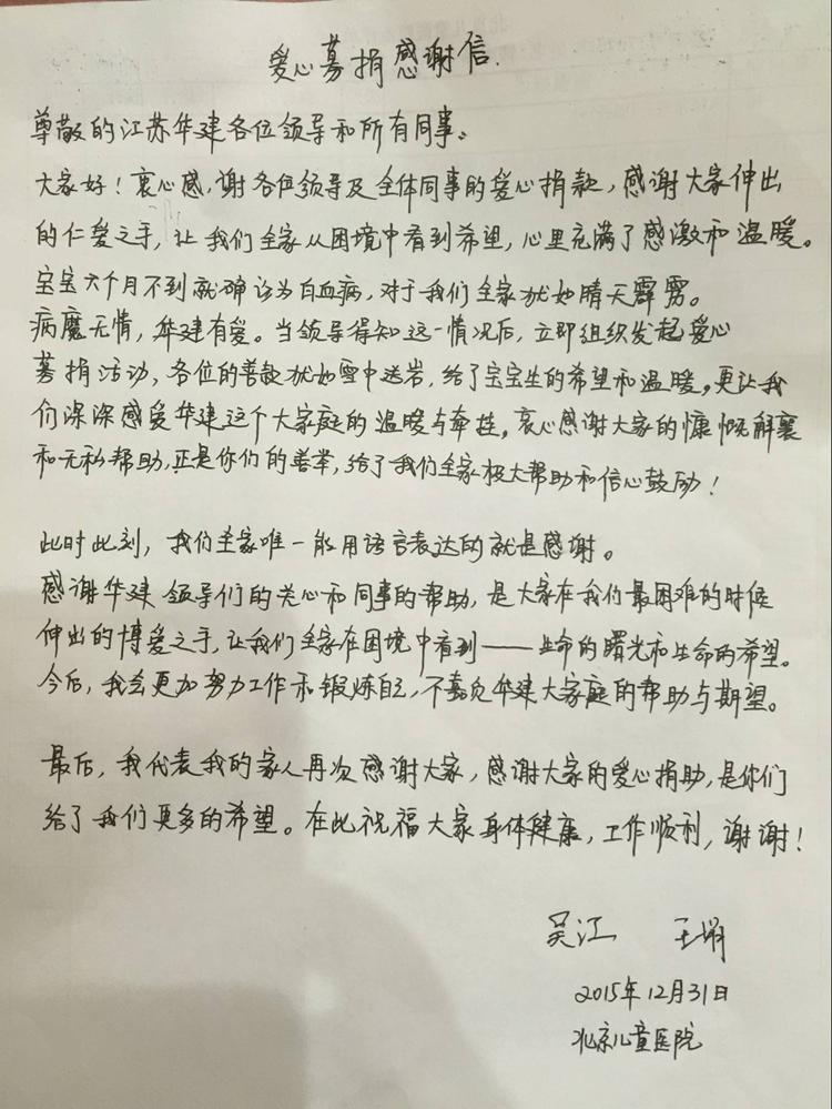 吳江是新加坡蘇揚公司的員工,近期他六個月大的兒子被診斷患有白血病,給他的家庭帶來了極大的精神負擔和經濟壓力,孩子患病消息也牽動著公司廣大干部員工的心,得知這一消息后,公司黨委高度重視,工會迅速發起愛心募捐倡議,各單位、各部門廣大干部員工踴躍奉獻愛心,截至目前已經籌集愛心捐款十萬余元。吳江特意發來感謝信,對給予其家庭幫助的同志們表示誠摯感謝!
