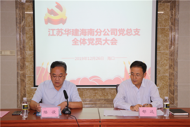 黨員大會上,海南分公司黨總支書記陸俊代表海南分公司黨總支委員會向大會作了題為“圍繞經濟抓黨建、抓好黨建促經濟”的工作報告。報告從牢固樹立政治意識,切實加強黨員學習教育;大力加強組織建設,切實發揮黨組織戰斗堡壘作用;持續開展黨風廉政建設,自覺踐行中央八項規定;深入開展黨群共建活動,凝心聚力促進公司穩定發展四個方面,回顧了自2016年12月8日換屆以來,海南分公司黨總支在江蘇駐瓊建工企業黨委和公司總部黨委的正確領導下,緊緊圍繞“服務經濟發展、促進和諧穩定”的主線,認真學習貫徹黨的十八大以來黨中央的新思想、新觀點、新部署和習近平總書記系列重要講話精神,以開展“創先爭優”、“兩學一做”和“不忘初心,牢記使命”主題教育等活動為載體,不斷加強黨的思想、組織、作風和制度建設,為江蘇華建海南分公司做強做優做大,實現公司健康穩定發展提供了堅強的思想、政治和組織保證。