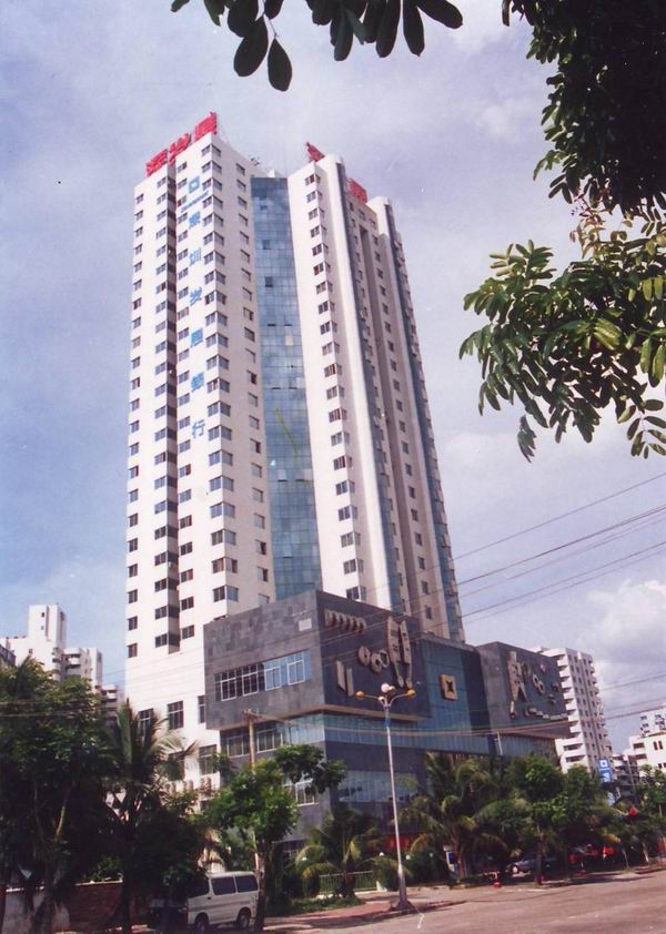 該工程共28層,其中地下2層,建筑總高度105.05m,建筑面積31890m2,框支剪力墻結(jié)構(gòu)體系。工程地下二層為人防,地下一層為停車場(chǎng),一至四層為辦公寫字間,四至五層設(shè)轉(zhuǎn)換層,兼作設(shè)備通風(fēng)層,五至二十六層為住宅。大廈設(shè)備齊全,有中央空調(diào)、3臺(tái)進(jìn)口電梯、進(jìn)口衛(wèi)生潔具、共用電視天線、消防控制中心等。外裝飾,一至四層為進(jìn)口藍(lán)寶石花崗巖,五至二十六層為白色條形面磚及鋁合金窗。內(nèi)裝飾,五至二十六層樓地面為拼木地板,客廳房間墻面及頂棚為多彩噴涂,衛(wèi)生間、廚房間為釉面磚墻及防滑地面磚,采用輕鋼龍骨石膏板吊頂。