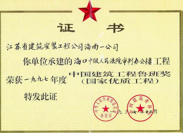 海口市中級人民法院審判辦公樓位于海口市金宇路8號,1995年4月竣工,1996年6月被評為海南省優質工程,并榮獲海南省優秀建筑二等獎,1997年12月榮獲魯班獎。