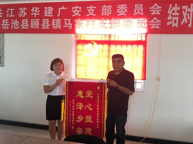 馬家村第一書記周莉莉首先介紹了黨支部黨建工作開展情況、扶貧工作開展情況和2017年扶貧工作思路。雙方重點就如何搭好支部共建平臺和2017年度脫貧幫扶工作進行了探討交流,簽署了黨支部《結(jié)對共建協(xié)議書》,并組織全體黨員面對黨旗重溫入黨誓詞和觀看黨史教育片《信仰》。廣安支部部分黨員還分別與馬家村11戶貧困家庭“一對一”結(jié)對,并贈送了防暑品和慰問金。為感謝公司一年來的愛心援助,馬家村特地贈送公司錦旗以示感謝。