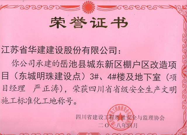 4月18日,重慶分公司項目創優再獲新成果,公司承建的岳池縣城東新區棚戶區改造項目(東城明珠建設點)3#、4#及地下室、官盛春天12#、13#樓被四川省建設工程質量安全與監理協會評為“四川省省級安全生產文明施工標準化工地”。至此,重慶分公司獲省級標化工地獎項已達3項。