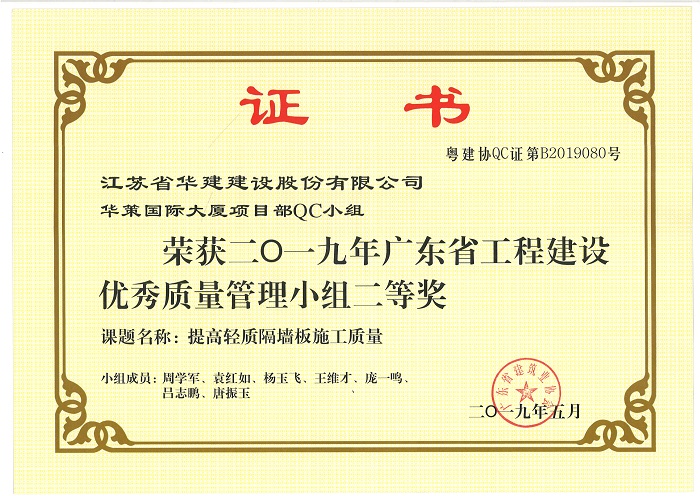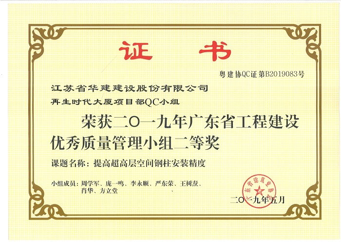 公司新添4項省級工程建設優秀QC成果 時間:2019-07-11 3929 近期,廣東省建筑業協會發文公布了2019年度廣東省工程建設優秀質量管理小組名單,公司華策國際大廈項目部QC小組“提高輕質隔墻板施工質量”、再生時代項目部QC小組“提高超高層空間鋼柱安裝精度”兩項成果喜獲二等獎,華策國際大廈項目部QC小組“提高鋼結構工程高強螺栓安裝合格率”榮獲三等獎。 華策國際大廈項目部QC小組“設備機房減振降噪的創新方法”成果在江蘇省建筑業協會組織的2019年度江蘇省工程建設質量管理小組活動中榮獲二等獎。
