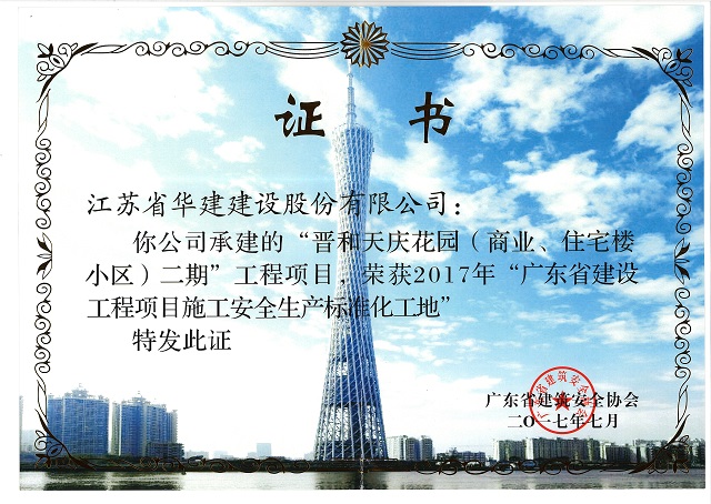 晉和天慶二期獲2017年廣東省建設(shè)工程項(xiàng)目施工安全生產(chǎn)標(biāo)準(zhǔn)化工地