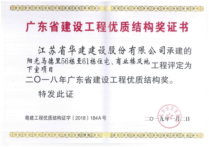陽光馬德里獲2018年廣東省建設工程優(yōu)質(zhì)結(jié)構(gòu)獎