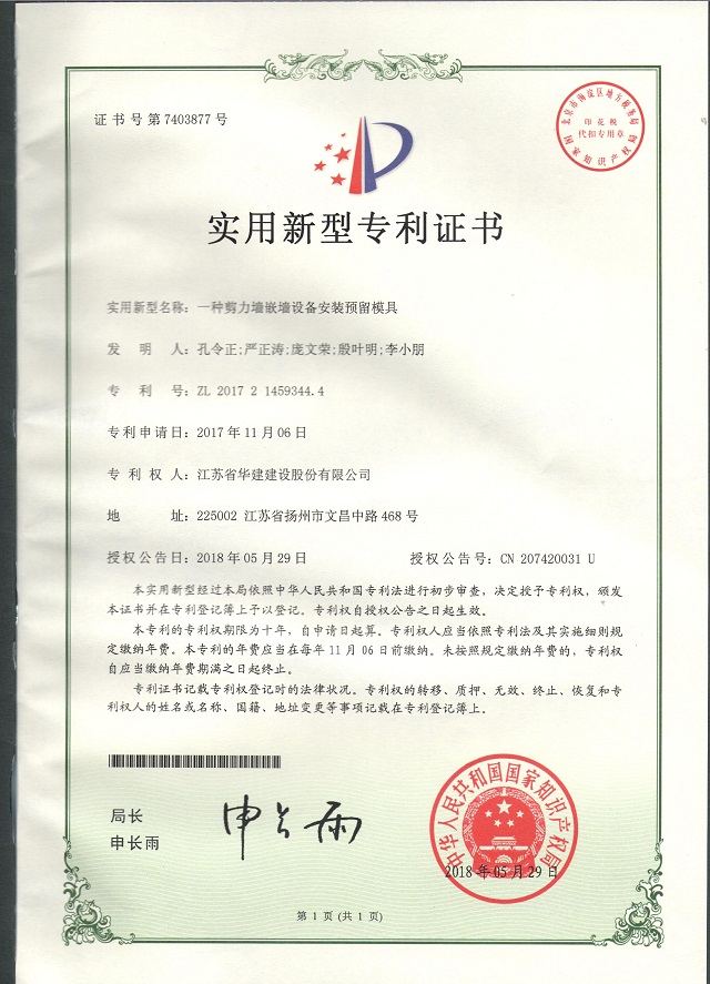 近日,從國家知識產權局傳來喜訊,公司申請的《一種剪力墻嵌墻設備安裝預留模具》獲得實用新型專...