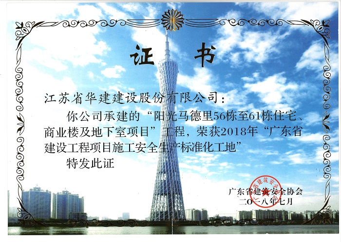 陽光馬德里獲2018年廣東省建設(shè)工程項(xiàng)目安全生產(chǎn)生產(chǎn)標(biāo)準(zhǔn)化工...