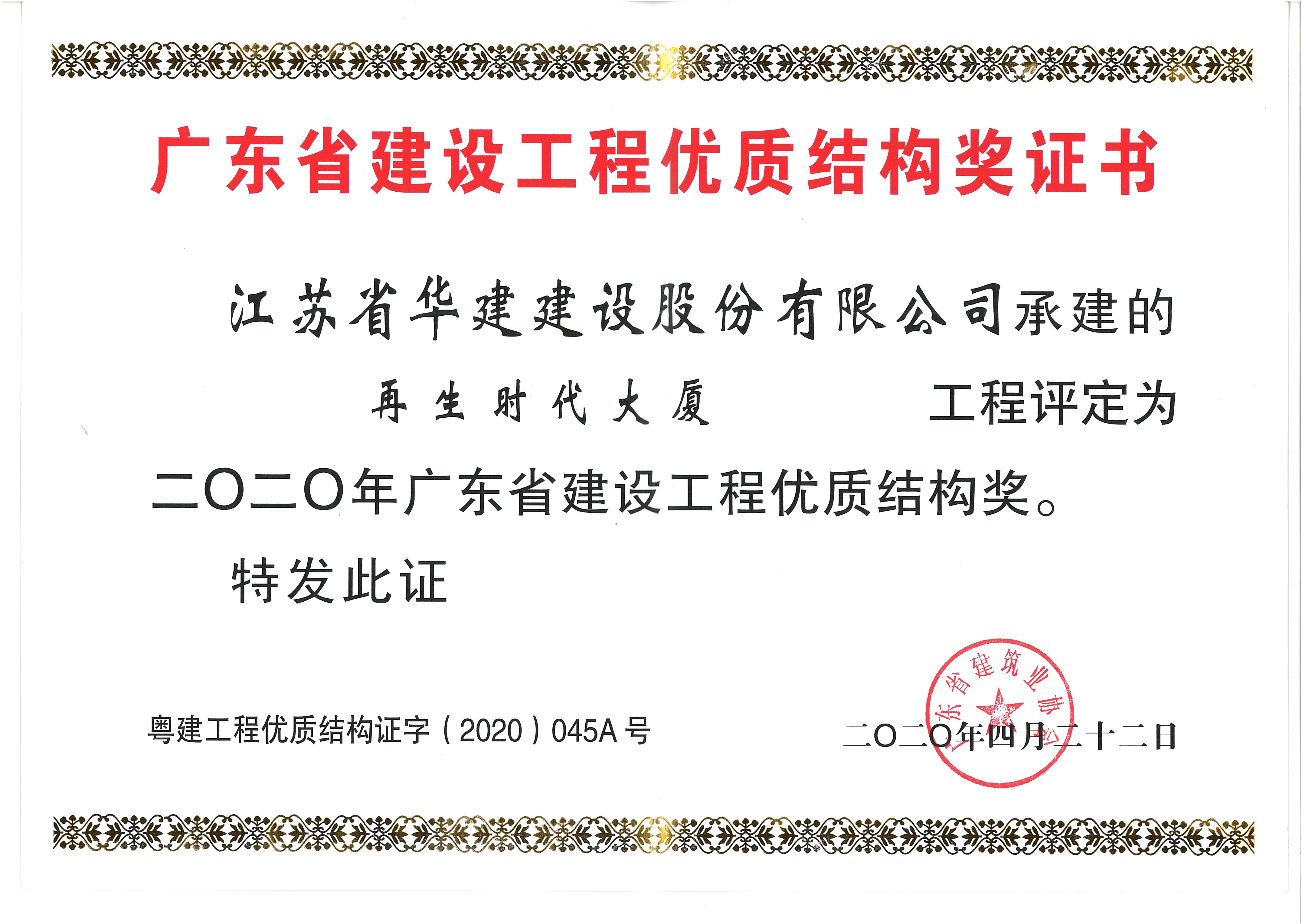 再生時代大廈獲2020年廣東省建設(shè)工程優(yōu)質(zhì)結(jié)構(gòu)獎