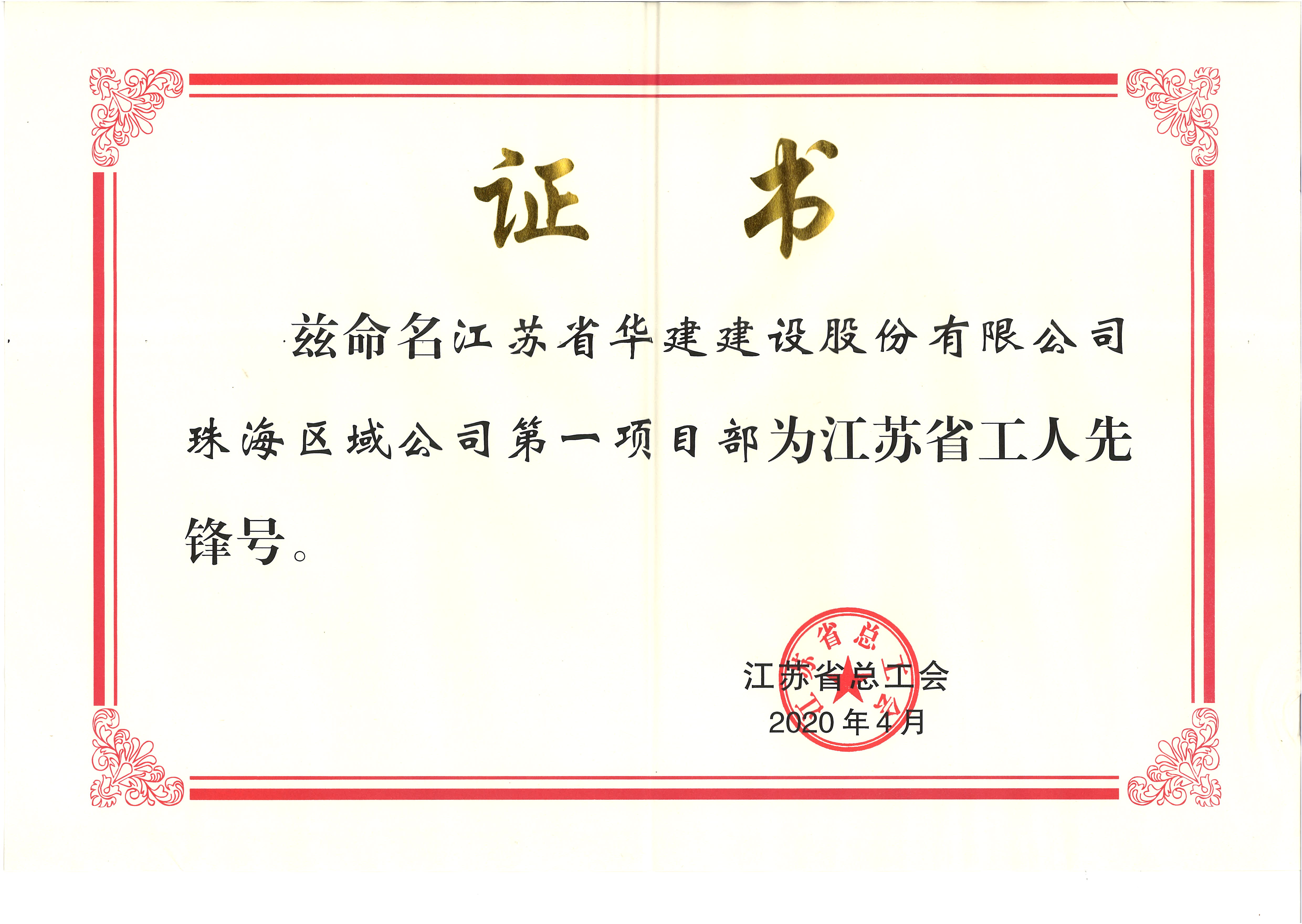 珠海區(qū)域公司第一項(xiàng)目部獲江蘇省工人先鋒號