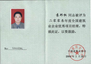 他本人先后被評為深圳市優秀項目經理、揚州市優秀項目經理、江蘇省優秀項目經理、江蘇省建筑業質量管理先進個人、揚州市勞動模范、江都市有突出貢獻的中青年專家、建設部優秀項目經理,在國家級刊物發表論文40多篇、省和國家級工法8項,并有5項專利,為企業的發展作出了較大貢獻。