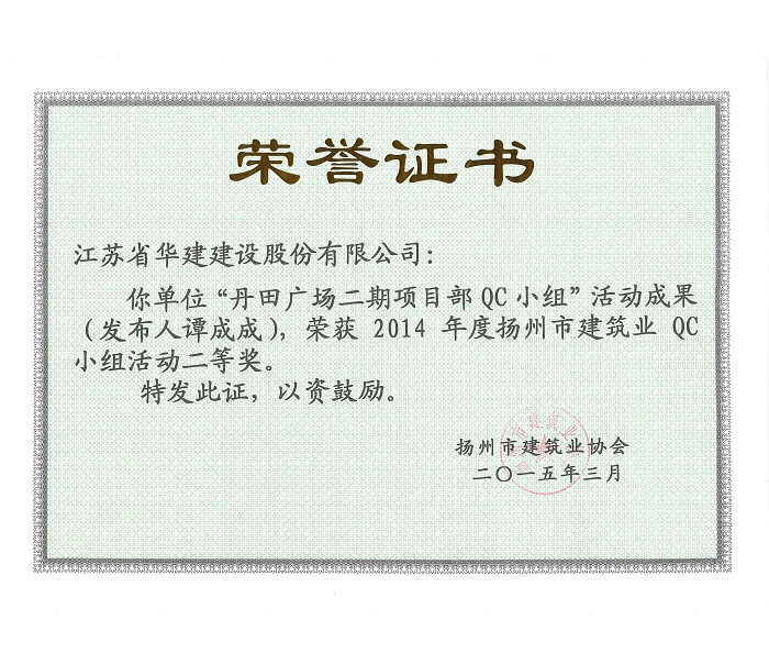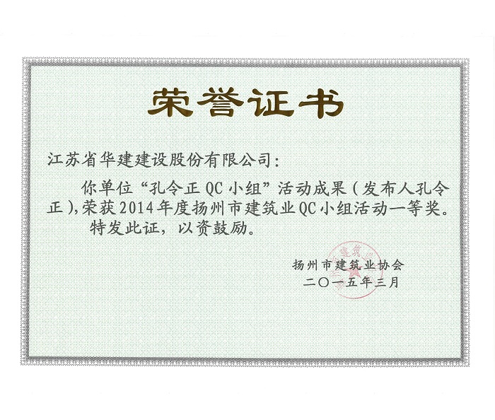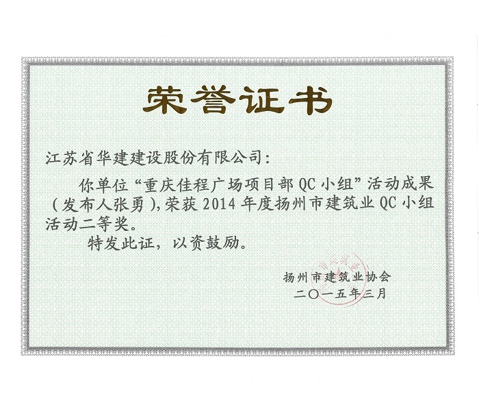 公司5項成果獲揚州市建筑業QC成果獎 時間:2015-03-31 4990 近日,揚州市建筑業協會發文表彰了2015年度全市建筑業QC小組活動成果獎,公司共有5項成果獲獎,其中,“孔令正QC小組”活動成果《剝蝕丘陵地貌多形截面鋼筋混凝土灌注樁施工新方法》榮獲一等獎,“佳程廣場5#樓項目QC小組”活動成果《提高核心筒筒體結構施工質量》、“重慶佳程廣場項目部QC小組”活動成果《提高現澆混凝土樓梯結構施工質量》、“丹田廣場二期項目部QC小組”活動成果《提高蒸壓加氣混凝土砌塊外墻合格率》榮獲二等獎,“馬賽公館項目部QC小組”活動成果《 提高耐磨金剛砂地面施工質量》榮獲三等獎。