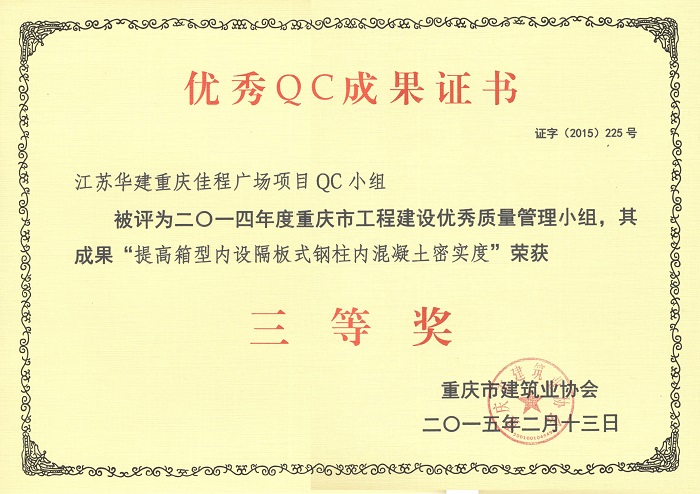公司3項QC成果榮獲重慶市三等獎 時間:2015-04-02 4877 近日,重慶市建筑業協會發文表彰了一批優秀QC成果,公司重慶佳程廣場項目QC小組被評為2014年度重慶市工程建設優秀質量管理小組,其成果“提高箱型內設隔板式鋼柱內混凝土密實度”、“剝蝕丘陵地貌多形截面鋼筋混凝土灌注樁施工新方法”、“重慶佳程廣場基礎工程大體積混凝土裂縫成因分析和預控”等均榮獲三等獎。